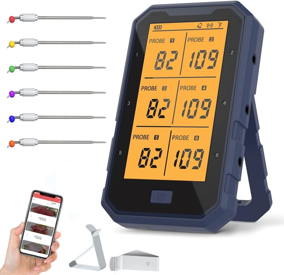 Wireless Meat Thermometer, Bluetooth Meat Thermometer for Grilling Digital BBQ Cooking Thermometer with 6 Probes, APP/Timer/Alarm Monitor Food Thermometer for Smoker Barbecue Oven Kitchen Turkey